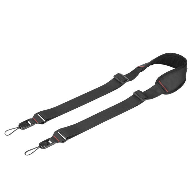 Dolžina traku je nastavljiva, največja dolžina je 160 cm, najmanjša dolžina pa 110 cm, da ustreza ljudem različnih velikosti. Edinstven sistem Rapid Link omogoča hitro pritrditev/odstranitev traku in zagotavlja varnejši način nošenja fotoaparata. Trak je opremljen s ploščico QR, ki je združljiva s stativi Arca-Swiss in Manfrotto® RC2. Štiri luknje za vrvico na štirih vogalih lahko uporabite za pritrditev priključkov Rapid Link za več načinov prenašanja fotoaparata.
