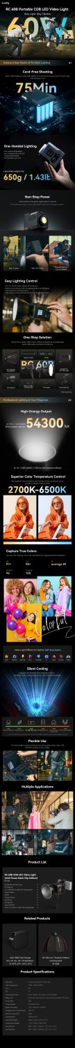 SmallRig RC 60B je nova generacija COB LED video luči, ki jo je na trg lansiral SmallRig. Zahvaljujoč novemu, samostojno razvitemu sistemu za upravljanje porabe energije in hlajenja, ima nova LED vgrajeno baterijo, ki lahko deluje 45 minut pri maksimalni moči, hkrati pa ohranja kompaktne mere in manjšo težo. Glavno ohišje je izdelano iz ognjevarnega PC+ABS…