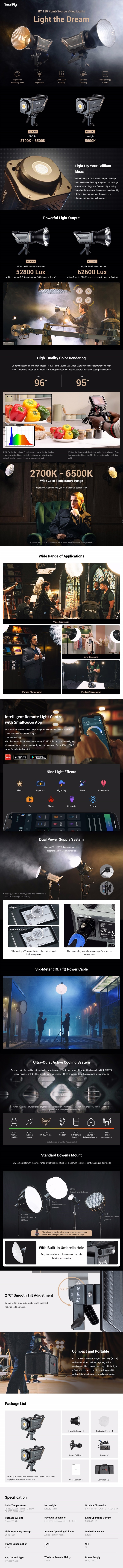 SmallRig RC120D (3612) predstavlja prvo generacijo profesionalnih studijskih luči LED SmallRig. Uporablja napredno tehnologijo COB (Chip-On-Board) LED za visoko intenzivnost (5.370 luksov) in reflektor z visoko učinkovitostjo za doseganje do 62.600 luksov v središču lumna na razdalji 1 m. Ponuja tudi visoko barvno natančnost (CRI 95+, TLCI 96+), bajonet Bowens…