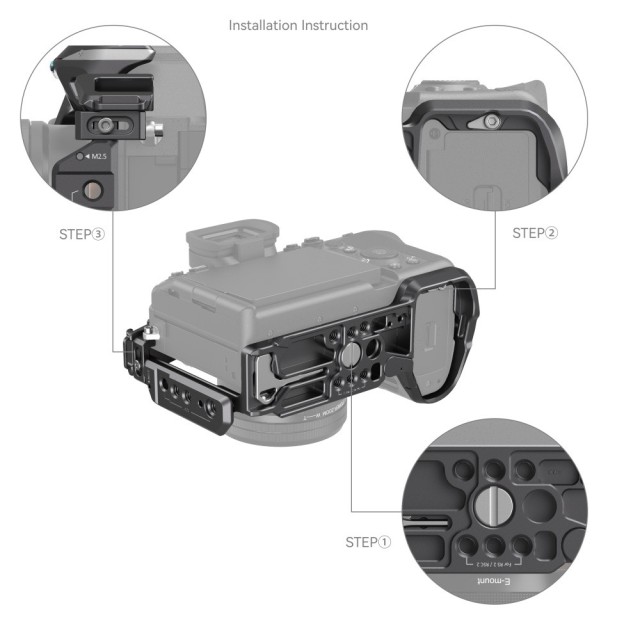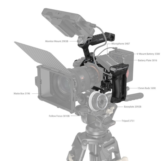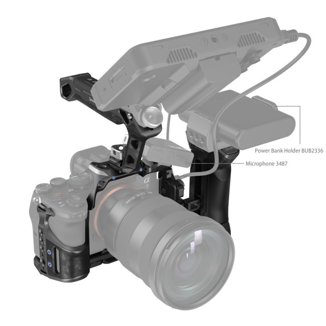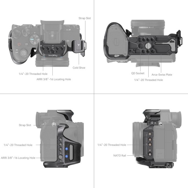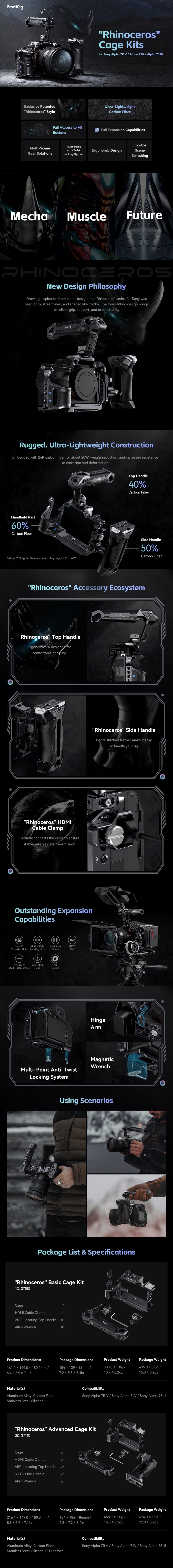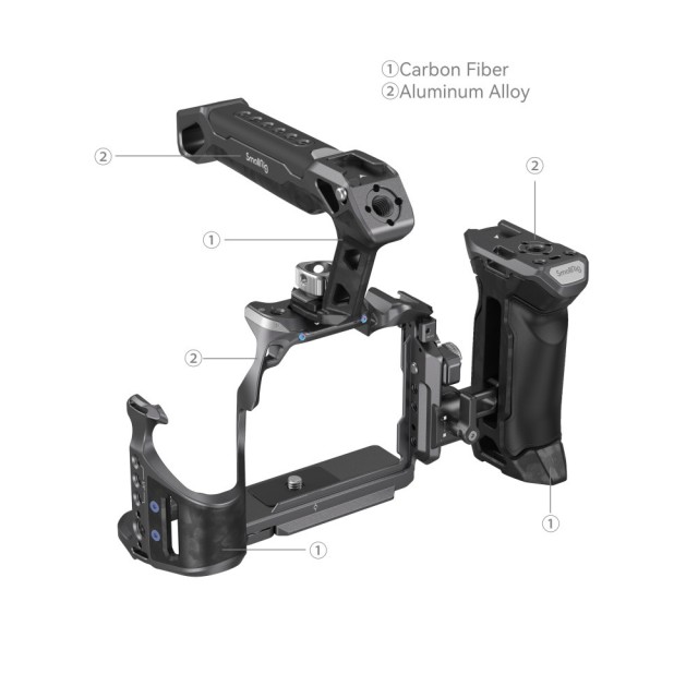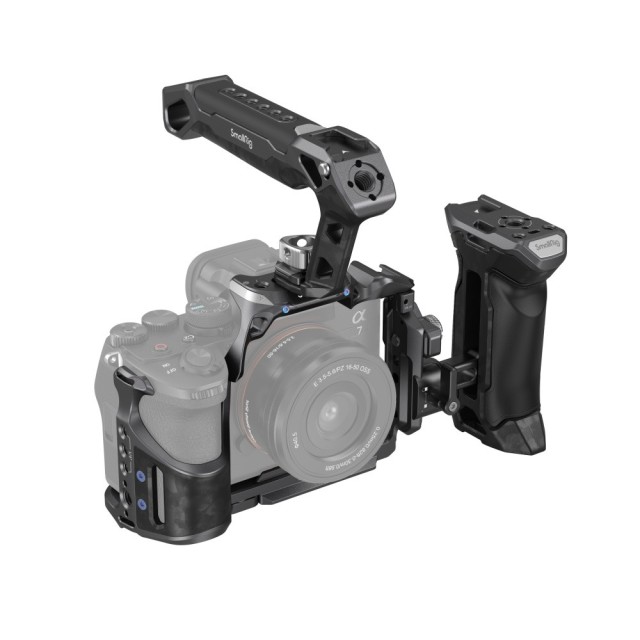 SmallRig "Rhinoceros" Advanced Cage Kit za Sony Alpha 7R V / Alpha 7 IV / Alpha 7S III 3710 je zasnovan tako, da zmanjšuje obremenitev ramen, povečuje stabilnost in zagotavlja točke za namestitev dodatne opreme. Komplet vključuje kletko, zgornji ročaj, stranski ročaj in objemko za kabel HDMI. Kletka in oba ročaja so prenosni, saj so izdelani iz lažjih ogljikovih vlaken, zato omogočajo daljše fotografiranje iz roke. V primeru kletke je fotoaparat trdno pritrjen skupaj s pozicijskim zatičem, vijakom 1/4"-20 in vijakom M2,5. Ima čisto poenostavljeno obliko, ki omogoča popoln dostop do zgornjih gumbov. Zgornji ročaj je udoben za prenašanje in fotografiranje pod nizkim kotom; stranski ročaj, izdelan iz lahkih ogljikovih vlaken in PU usnja, omogoča udoben in trden oprijem. objemka za kabel HDMI, ki se zategne z vijakom s ploščato glavo, pa ščiti vmesnik in zagotavlja stabilen prenos signala. Komplet ima tudi luknje z navojem 1/4"-20 za Magic Arm 3873, hladne čevlje za mikrofon, video luč LED in luknje za pozicioniranje ARRI 3/8"-16 za stranski ročaj 2914. K vsestranskosti kletke pripomorejo tudi tirnice NATO in plošča za hitro sproščanje Arca-Swiss. Zlasti ploščica Arca-Swiss omogoča hitro preklapljanje med načini držanja iz roke, stativa in kardana (DJI RS 2 / RSC 2 / RS 3 / RS 3 Pro).