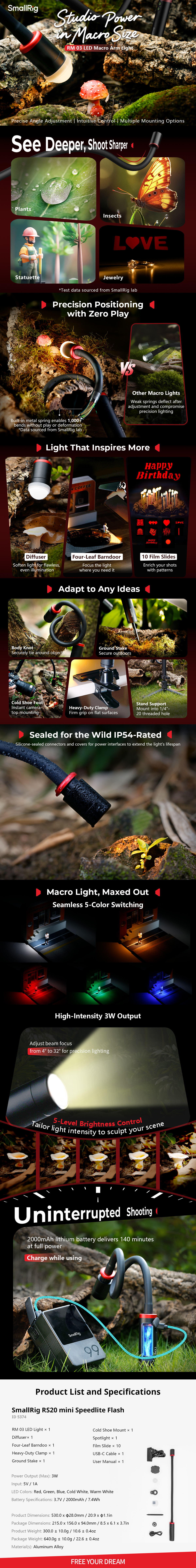 RM 03 je specializirana LED-lučka, zasnovana za makro fotografijo. Njena trdna vgrajena kovinska vzmet omogoča enostavno nastavitev kota osvetlitve. Opremljena je z dodatki za nadzor svetlobe, vključno z difuzorjem in štirilistnim zaslonkom, ter z večnamenskimi možnostmi pritrditve, kot sta močna sponka in zemeljski kolik, kar zagotavlja neprimerljivo prilagodljivost. Z zaščito IP54 za odpornost proti vremenskim vplivom in petimi močnimi 3W LED-diodami, ki podpirajo večbarvno svetlobo, RM 03 navdihuje neomejeno in dolgotrajno (do 140 minut delovanja) ustvarjalnost v makro fotografiji.