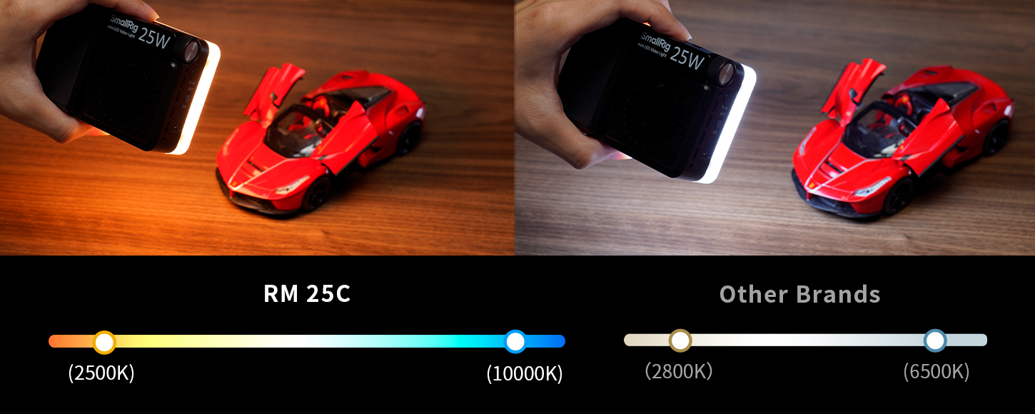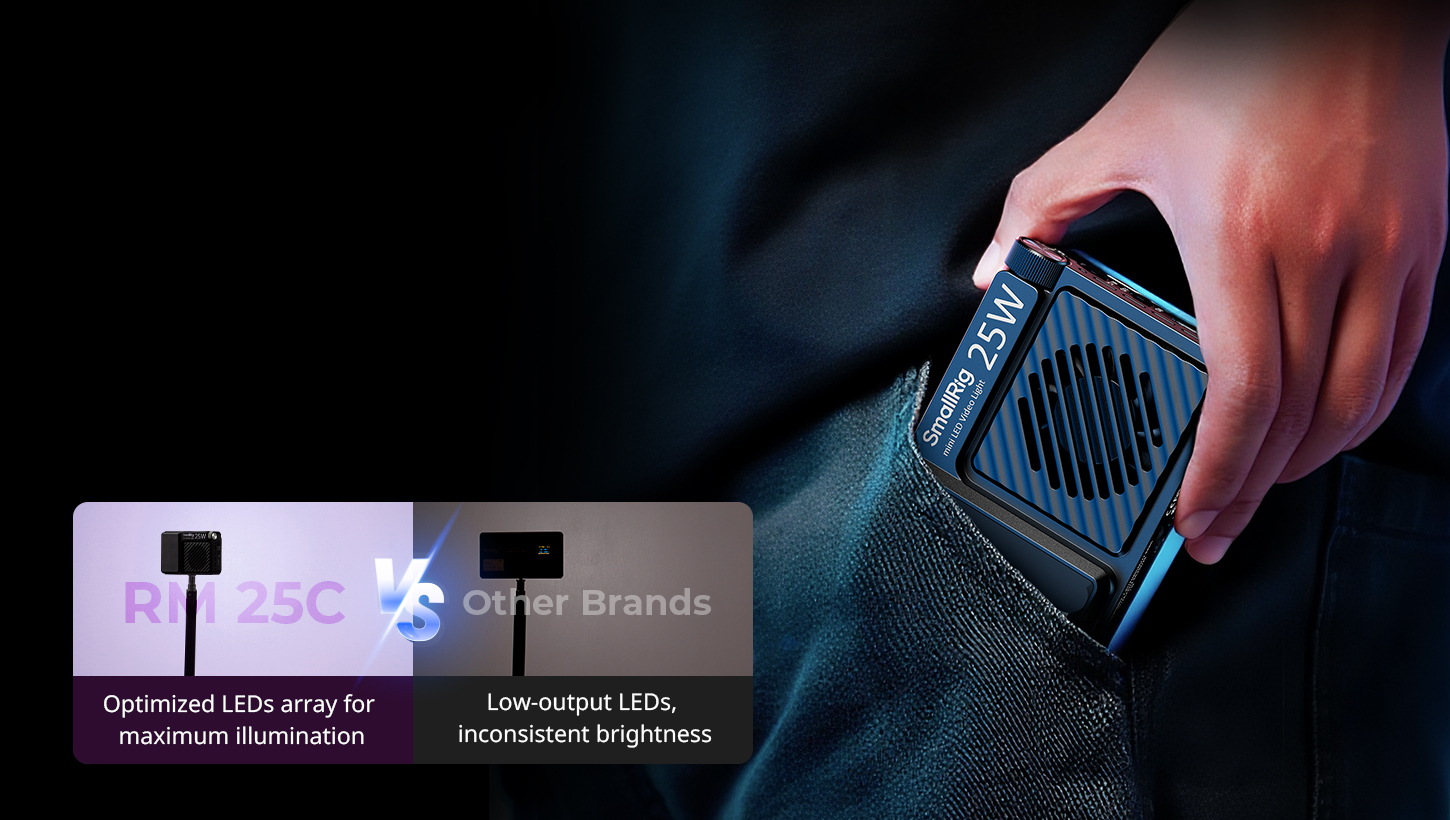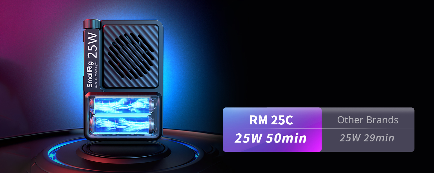 SmallRig RM 25C mini LED video luč z vgrajeno baterijo. Vsestranska osvetlitev RGB+CCT: Ima CRI 96, TLCI 99, nastavljive dvobarvne temperature od 2500K do 10000K, več kot 36 000 barv in 14 vgrajenih svetlobnih učinkov. Idealna za fotografiranje fotografij, hrane in ustvarjalno osvetlitev portretov.