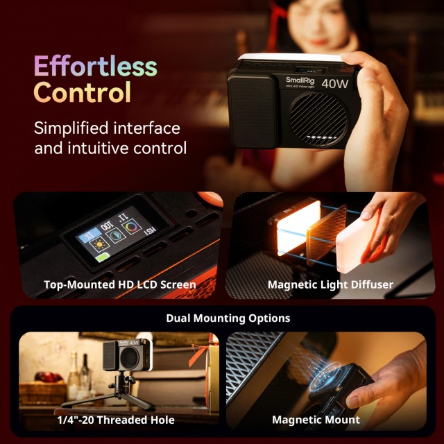 SmallRig RM 40C je 40 W močna mini LED-lučka RGBWW. Kompaktna, a zmogljiva, ima podaljšan čas delovanja 55 minut in polno barvno RGB-osvetlitev za širši nadzor barvne temperature in barvnega spektra. Z uporabniku prijaznim upravljanjem, magnetnim pritrdilom in hitrim polnjenjem PD je idealna za ustvarjalce, ki so veliko na poti.