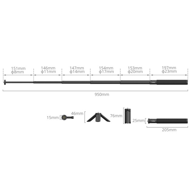 SmallRig Selfie Stick za akcijske kamere 5403 vključuje palico za selfije, objemko za pametni telefon, nastavek za akcijsko kamero, stativ in zapestni trak. Ta izdelek, ki je izdelan iz aluminijeve zlitine letalske kakovosti za večjo trdnost in vzdržljivost, ima šestkotne raztegljive dele, da se akcijska kamera ne zvija, zato je bolj stabilna. Žepna palica, ki se raztegne do 95 cm in zloži na samo 20 cm, je opremljena tudi s številnimi dodatki za podporo pametnemu telefonu in akcijski kameri, kot so GoPro HERO13 Black, insta360 X5, DJI Action 5 Pro, AKASO. Zlasti pri uporabi kamere insta360 X4 lahko palico odstranite s fotografij in videoposnetkov. Med dodatno opremo je zapestni trak, ki pomaga, da sta ta palica in fotoaparat varno pritrjena na vaše zapestje, kar zagotavlja varnost; stativ, ki ima na vrhu en vijak 1/4"-20, pritrdite na to palico prek spodnje luknje z navojem 1/4"-20 za skupinsko fotografiranje, fiksni posnetek itd.