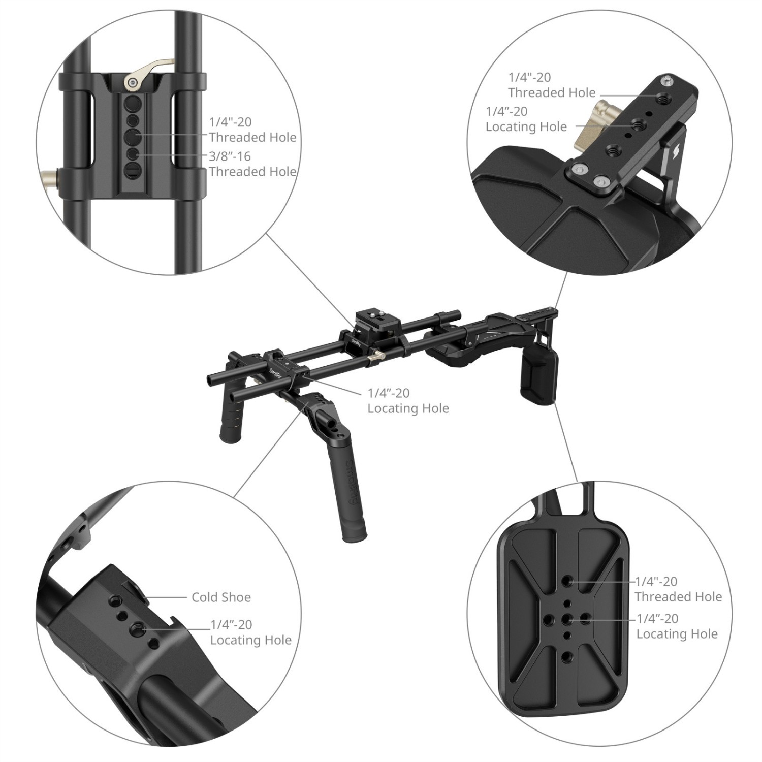 SmallRig Shoulder Rig Kit(klasična različica) 4480Bje zasnovan tako, da zagotavlja udobno rešitev za snemanje z ramo. Z uporabo univerzalnega sistema z dvojno 15-milimetrsko palico se lahko prilagodi različnim specifikacijam kamer. Navpični kot ročaja je 15°, nastaviti pa ga je mogoče z vrtenjem za 360°, kar je bolj v skladu z navado prijemanja; priključek ročaja ima le eno zaporno vijako, kar je bolj priročno in hitreje za uporabo. Komplet pritrdilne plošče z dvojno 15-mm sponko za palico na vrhu uporablja specifikacijo Arca-Swiss, kar omogoča hitro snemanje kamere s pomočjo priložene plošče Arca-Swiss, kletka z vgrajeno ploščo Arca-Swiss pa se za namestitev enostavno vstavlja; Z gumbom lahko zaklenete obe 15-milimetrski palici, da hitro razstavite in prilagodite težišče opreme; na dnu vgrajenih navojnih lukenj 1/4“-20 in 3/8”-16 lahko namestite ploščo za hitro sprostitev, da dosežete hitro preklapljanje med nošenjem na rami in stativom. Ramenska in hrbtna blazinica sta izdelani iz visoko elastičnega materiala, primernega za lok ramena, ergonomični in zagotavljata udobno izkušnjo pri nošenju na rami; hrbtna blazinica je nastavljiva spredaj in zadaj, primerna za ljudi različnih velikosti, in lahko učinkovito prepreči, da bi oprema zdrsnila naprej; ramenska blazinica in hrbtna blazinica imata vgrajene 1/4“-20 navojne luknje in 1/4“-20 pritrdilne luknje, ki omogočajo razširitev dodatkov, kot so baterije V-mount, protiutež in drugi dodatki.