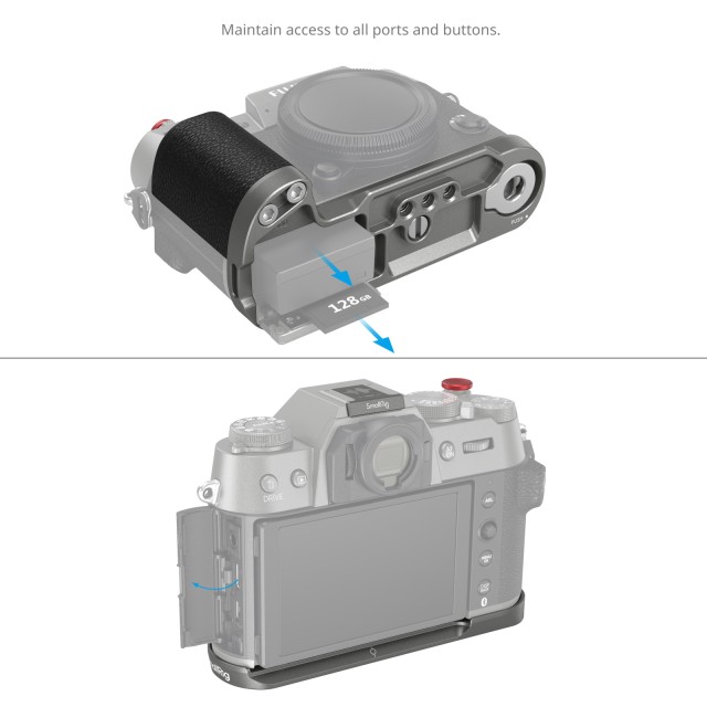 SmallRig Silikonsko držalo v obliki črke L za FUJIFILM X-T50 (Charcoal Silver) 4712 je zasnovano tako, da izboljša oprijem fotoaparata. Držalo v obliki črke L se na fotoaparat pritrdi z vijakom 1/4"-20 na dnu, vgrajene silikonske blazinice pa preprečujejo praske. Tekstura in barva ročaja se popolnoma ujemata s fotoaparatom FUJIFILM X-T50. Vgrajena Arca-Swiss osnovna plošča za hitro sproščanje omogoča enostavno in hitro montažo in demontažo stativa tipa Arca. Štiri luknje z navojem 1/4"-20 na dnu za pritrditev ploščic in stativov tipa Manfrotto. Reža za zapestni trak (ID: 3848). Vgrajen ploščati ključ na dnu za enostavno sestavljanje in razstavljanje dodatne opreme. Držalo je opremljeno z ekskluzivnim pokrovom vroče čevlje, na katerem sta odtisnjena zvočni val "FUJIFILM" in leto ustanovitve kot naš poklon družbi FUJIFILM. Opremljen je tudi z gumbom za sprostitev zaklopa, ki zagotavlja mehak in udoben dotik s prsti.