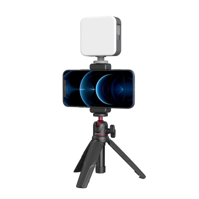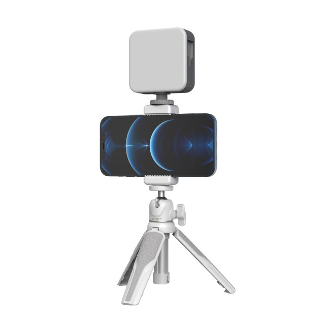 Komplet Smallrig simorr Vigor VK-30 Vlog Kit 3509 je sestavljen iz prenosnega stativa za vloganje, standardne sponke za telefon in luči LED Vibe P96, zato je kompakten in prenosen. Stativ se na telefonsko sponko pritrdi z vijakom 1/4, telefonska sponka se na lučko pritrdi s standardno vtičnico hladne čevlje na vrhu, lučka pa ima 3 standardne luknje, ki jih je mogoče razširiti za bogatejšo opremo. Stativ varno drži 1,5 kg. Svetloba LED P96 ima temperaturno območje 2700k-6500k, baterija pa zdrži največ 13,5 ure.