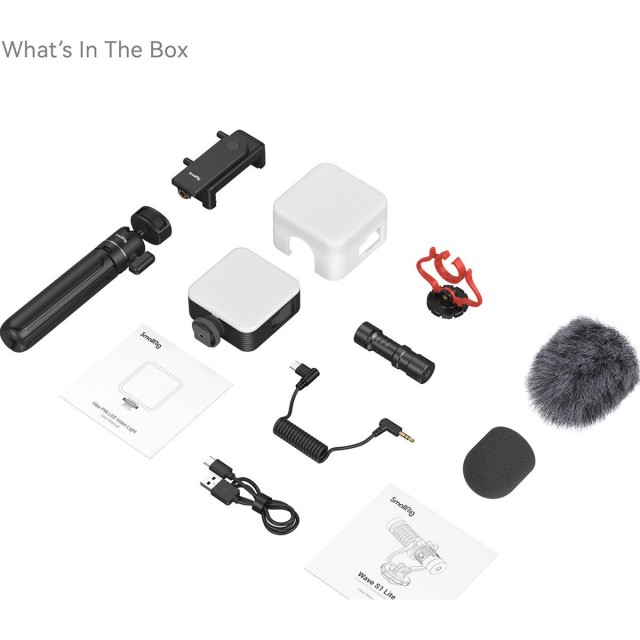 SmallRig Smartphone Vlog Tripod Kit VK-50 Advanced Version 4369 je sestavljen iz namiznega teleskopskega stativa, držala za pametni telefon Easy Loading, mikrofona na fotoaparatu Wave S1 Lite, video luči LED Vibe P96 in mehkega boksa. Ta kompaktni in prenosni komplet ima impresivno nosilnost 1,5 kg. En vijak 1/4"-20 pritrdi stativ na držalo za pametni telefon, ki ga odlikuje edinstvena zasnova z enostavnim izvlekom za hitro pritrditev in odstranitev pametnega telefona. 360-stopinjsko vrtenje držala omogoča varen in hiter preklop med pokončno in ležečo orientacijo, medtem ko par nastavkov za hladno čeveljc omogoča pritrditev združljive dodatne opreme. Poleg tega je video luči LED priložena trojica nastavkov za hladno čevelj, ki omogočajo pritrditev večjega števila dodatne opreme. Ima temperaturo 2700-6500K in življenjsko dobo baterije do 13,5 ure. Stativ je mogoče zložiti na samo 16 cm. Mikrofon za snemanje s 3,5 mm (0,13 palca) kablom na tip C (priložen je tudi adapter Type-C na Lightning) za neustavljivo doživetje.