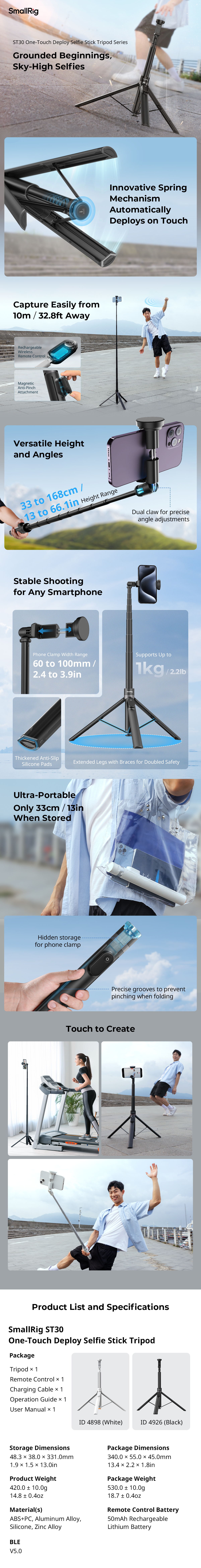SmallRig ST30 One-Touch Deploy Selfie Stick Tripod (White) 4898 je vsestranski pripomoček, zasnovan za nemoteno prilagajanje različnim scenarijem fotografiranja. S prilagodljivo funkcijo brezstopenjskega prilagajanja dolžine se ta naprava brez težav raztegne od 33 do 170 cm in tako zadovolji najrazličnejše potrebe fotografiranja. Daljinski upravljalnik Bluetooth omogoča stabilno povezavo na razdalji 10 m in se magnetno pritrdi na palico za selfije.