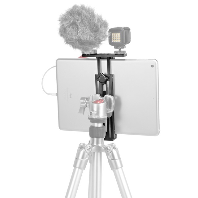 Držalo za tablični računalnik SmallRig za iPad je zasnovano tako, da vam olajša držanje in namestitev iPada. Združljiv je z iPadi velikosti od 7,9 do 12,9 palca ali katero koli drugo blagovno znamko podobne velikosti, z ovitkom ali brez njega. Vgrajene gumijaste blazinice preprečujejo praske na iPadu med pritrjevanjem. Opremljen je s podstavkom z navojem Arca-Swiss 1/4 za hitro pritrditev/demontažo stativa in ima majhno težo 184 g.