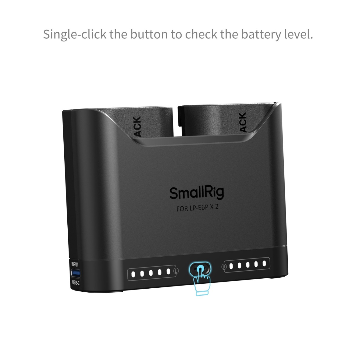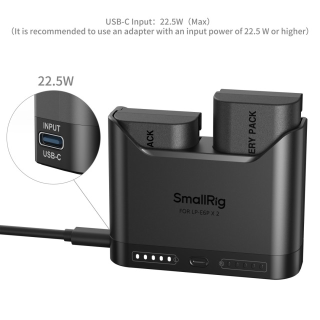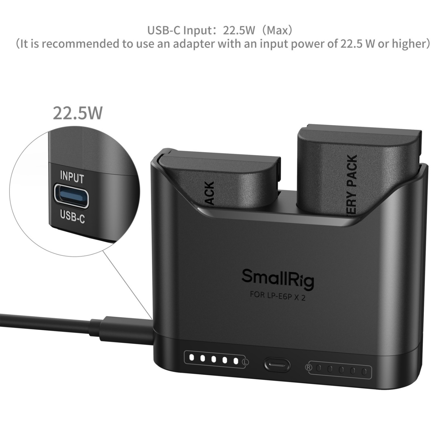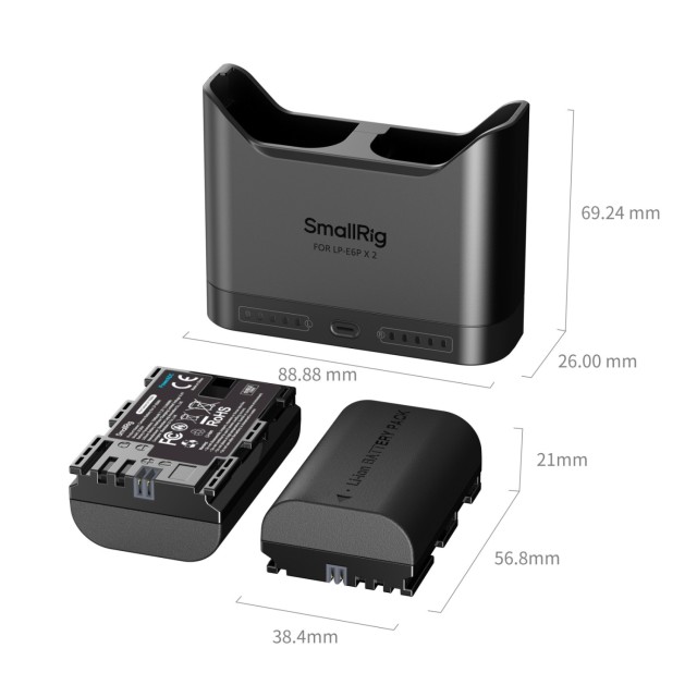 SmallRig Turbo Charging Kit za LP-E6P kamere baterije 5485 vključuje dve visoko zmogljivi bateriji in dvo-kanalni hitri polnilnik. Opremljen s polnim dekodirnim čipom, ta komplet zagotavlja popolno združljivost z Canon LP-E6P baterijami, ki podpirajo kamere, kot je EOS R5 II. Odpravlja pojavna opozorila, hkrati pa ohranja prikaz moči v kameri in združljivost z originalnimi Canon polnilniki.