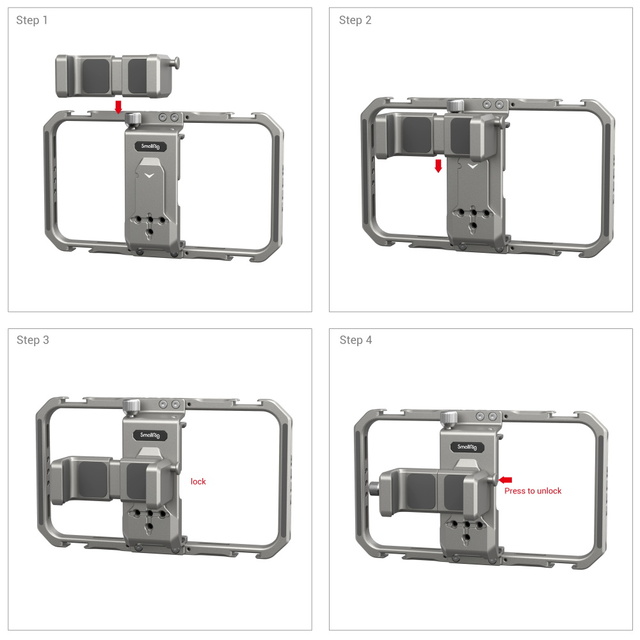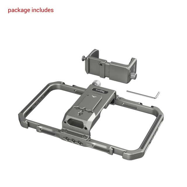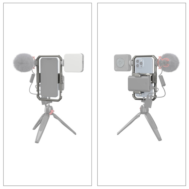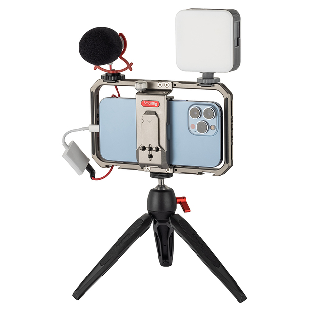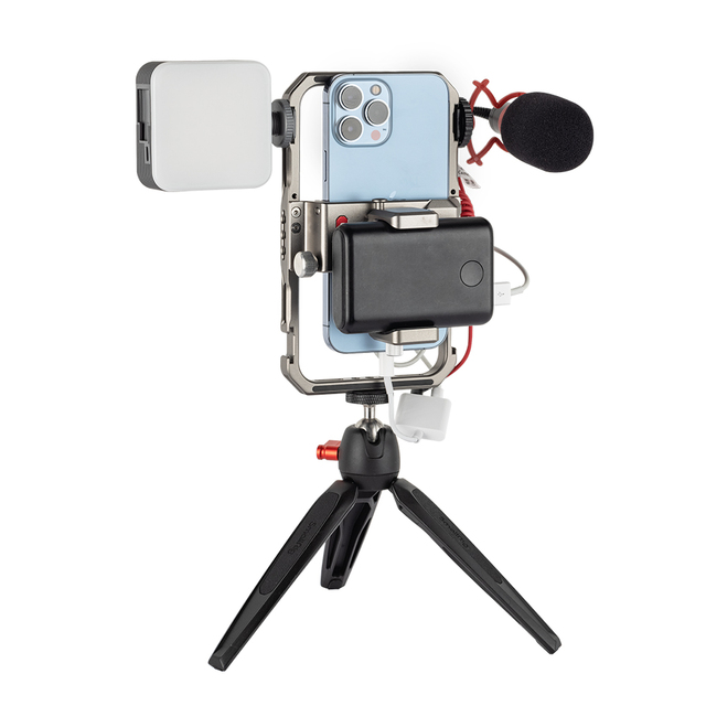 SmallRig Universal Lite Video Kit za iPhone serije 3611 je kompakten večnamenski komplet, zasnovan za profesionalno videografijo, prenos v živo in vloganje. Opremljen je z luknjami z navojem 1/4"-20 proti vrtenju in dodatki za hladno podnožje, kot so stranski ročaj 2772, stativ BUT2429, mikrofon 3452 in luč LED 3286; na zadnji strani ima magnetno zasnovo za hitro odpenjanje za varno pritrditev držala za banko energije, kar zagotavlja popolno rešitev za napajanje pri snemanju z mobilnim telefonom. Držalo za pametni telefon je mogoče natančno nastaviti levo in desno, da ne blokira gumbov, deljena zasnova ne moti signala mobilnega telefona, vgrajene blazinice pa pomagajo povečati stabilnost in preprečiti praske. Ko je telefon nameščen na kletki, omogoča vodoravno in navpično snemanje.