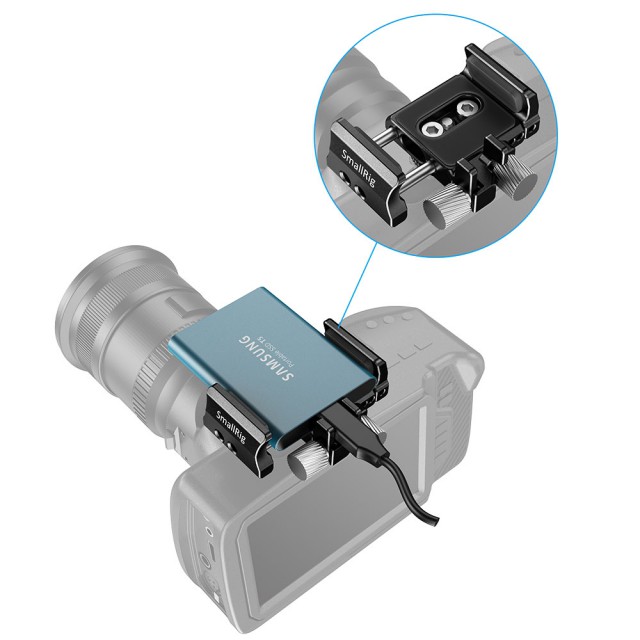 Univerzalni zunanji nosilec SSD SmallRig BSH2343 je zasnovan za namestitev SSD na kamere, kot so BMPCC 4K in 6K ter Z Cam E2. Ta vzmetna sponka je razširljiva na obeh straneh in ustreza različnim SSD-jem, kot so Samsung T5 SSD, Angelbird SSD2go PKT, Glyph Atom SSD, SanDisk 1T SSD, G-Technology G-DRIVE Mobile SSD in drugi. Opremljen je z odstranljivo hladno vtičnico, ki jo lahko pritrdite na spodnji ali stranski del nosilca, da SSD priključite na hladno vtičnico; ko jo odstranite, lahko za pritrditev nosilca uporabite vijake 1/4'-20, ki so zelo prilagodljivi. V notranjosti ima mehke zaščitne gumijaste blazinice, ki trdno držijo SSD v objemki in preprečujejo praske. Poleg tega je priložena kabelska objemka za priključitev kabla USB-C, ki se pritrdi z gumbnim vijakom. Ta nosilec za SSD je kompakten in vsestranski za fotografe in snemalce.