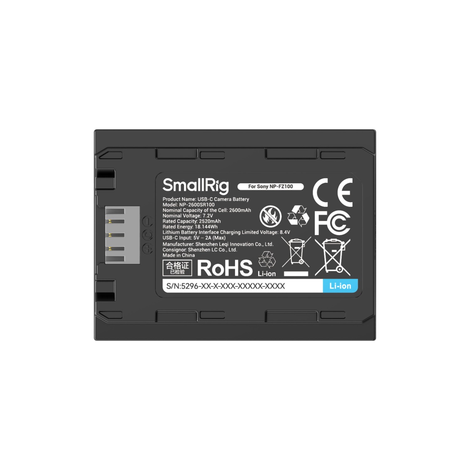 Baterija SmallRig 5296 NP-FZ100 USB-C je zmogljiva in zanesljiva nadomestna baterija, zasnovana za profesionalne in navdušene uporabnike fotoaparatov Sony. Z izhodno napetostjo 7,2 V in visoko zmogljivostjo 2600 mAh (17,28 Wh) zagotavlja daljši čas snemanja za zahtevne fotografske in video delovne tokove. Baterija je popolnoma dekodirana, kar pomeni, da natančno komunicira z združljivimi Sony kamerami brez opozorilnih pojavnih oken in se ujema z velikostjo originalne baterije za brezhibno prileganje in delovanje.