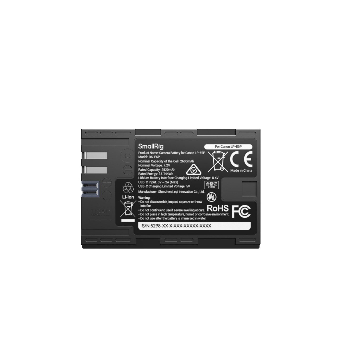 Baterija SmallRig za fotoaparat Canon LP-E6P 5298 ima 5 LED indikatorjev za spremljanje stanja napolnjenosti v realnem času. Rdeča opozorilna lučka opozori uporabnika na nizko stanje baterije in tako prepreči nepričakovano izklopljenje med kritično uporabo. Vgrajeni USB-C priključek omogoča polnjenje prek powerbank, stenskih adapterjev, avtomobilskih polnilnikov ali namenskih polnilnikov za fotoaparate, kar zagotavlja udobno polnjenje kadarkoli in kjerkoli.