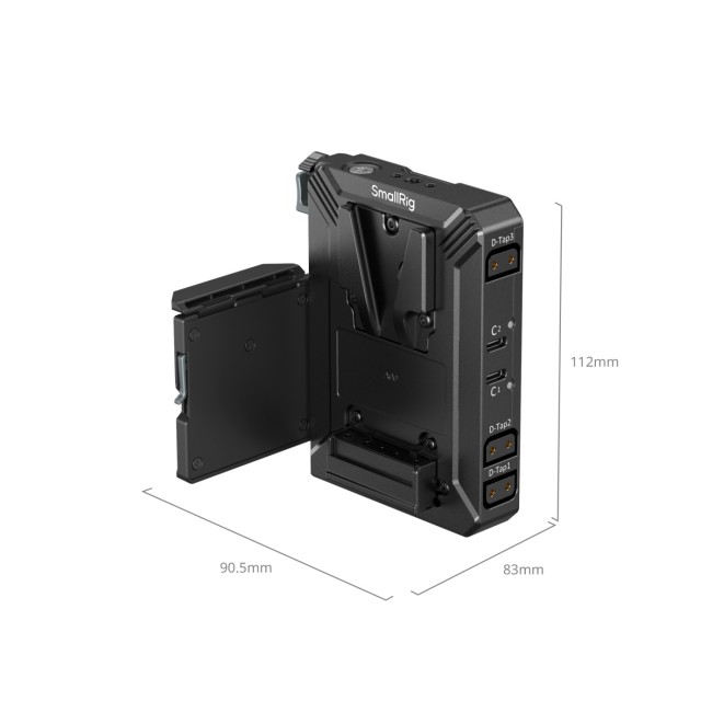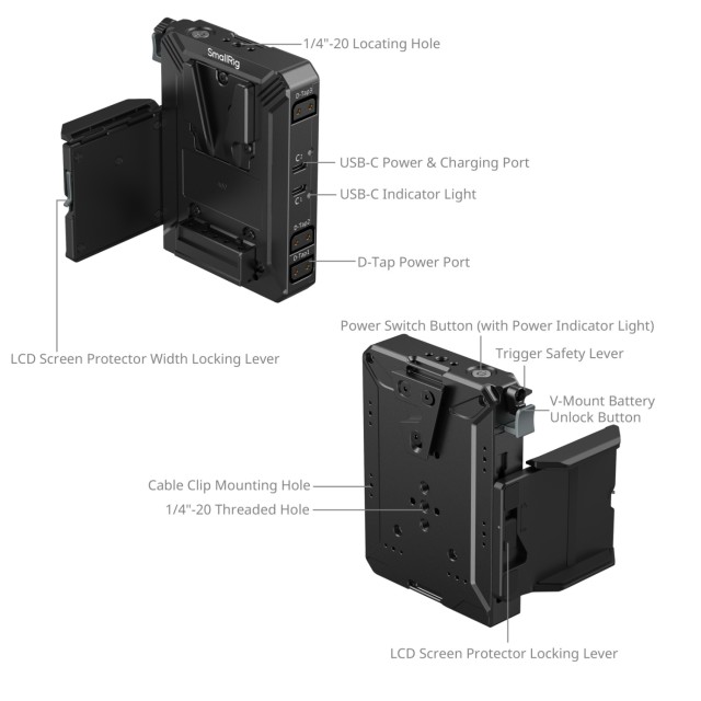 SmallRig V-Mount Battery Mount Plate ponuja preprosto rešitev za vgradnjo baterij V-mount v vašo kamero. Ta sistem, zasnovan za hitro vgradnjo baterij in distribucijo energije med več napravami, vključuje ploščo za baterije V-mount in modularni zaščitnik zaslona LCD. Plošča se varno pritrdi na združljive kamere, kar omogoča hitro zamenjavo baterij in neprekinjeno napajanje.