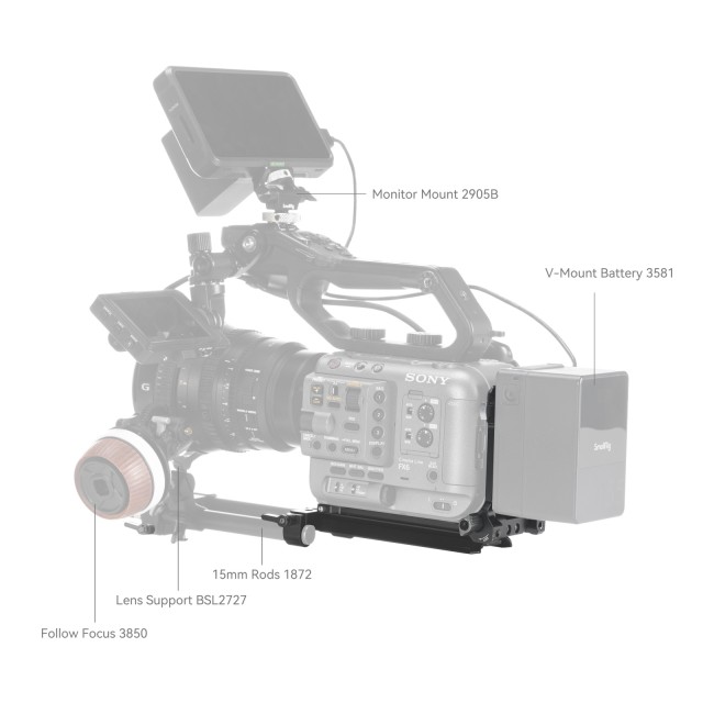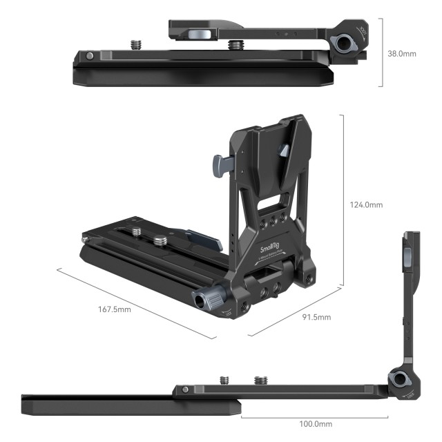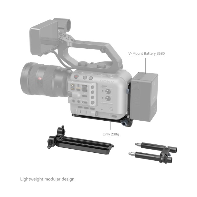 SmallRig V-Mount Battery Mount Plate Kit for Cinema Cameras 4323 je kompaktna, lahka, hitra in celovita rešitev za razširitev baterije V-Mount za majhne kinematografske kamere. Komplet vsebuje komplet plošče za namestitev baterije V-Mount, 15 mm objemko za palice, 15 mm palice in nosilec za namestitev brezžičnega sprejemnika. Komplet plošče za namestitev baterije V-Mount ima integrirano zasnovo in je pripravljen za namestitev, kar omogoča hitro namestitev baterije V-Mount. Zaradi modularne zasnove tehta komplet plošče za namestitev baterije V-Mount približno 300 g, z odstranjeno spodnjo ploščo za hitro sprostitev Manfrotto 501 pa le 230 g, kar olajša fotografiranje iz roke. Osnovno ploščo je mogoče raztegniti za približno 100 mm / 4,0 in tako hitro rešiti težišče zaradi težkih objektivov.
