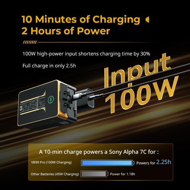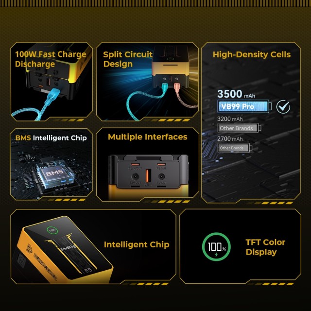 SmallRig VB99 Pro Power Bank (BumbleBee Edition) 5527 je približno 70 % velikosti običajne baterije V-mount, saj ima visoko integrirano zasnovo, ki zavzema manj prostora, zaradi česar je lažja in bolj prenosna! Visoko integriran (čip za protokol hitrega polnjenja + MCU + nadzor povečanja napetosti) čip BMS podpira široko paleto glavnih protokolov hitrega polnjenja (PD / QC / PPS itd.), dvosmerno 100 W (maks.) hitro polnjenje USB-C PD, kot tudi prilagodljivo povečanje napetosti/prilagodljivo regulacijo toka itd.! Poleg tega njegov prilagojen inteligentni sistem BMS zagotavlja hitrejše in varnejše polnjenje z več zaščitami pred prenapetostjo / kratkim stikom / pregrevanjem / prenapetostjo itd. Vključeni so tudi vmesniki, kot so D-tap / USB-C / USB-A / 8V-OUT / 12V-OUT / BP elektroda, za učinkovito polnjenje/napajanje kamere/kamkorderja/monitorja/brezžičnega video oddajnika/LED video luči/mobilnega telefona/prenosnega računalnika itd. brez uporabe V-mount plošče za pretvorbo! Čip BMS ima 16-bitni ADC / algoritem za merjenje moči, skupaj z MCU in digitalnim zaslonom TFT, da lahko ves čas spremljate stanje baterije. Vgrajena vrhunska visoko zmogljiva baterija (brez precenjene zmogljivosti), ki je polnilna in stabilna ter izpolnjuje MSDS / UN38.3 / IEC62133 / UL2054 / UL62368 in druge mednarodno priznane standarde. Njegovo ohišje je izdelano iz trpežne, padcem odporne aluminijeve zlitine in ognjevarne PC-plastike, na sprednji strani pa ima trpežno, odporno proti praskam PC- in akrilno prevleko, s TFT barvnim zaslonom, ki jasno in natančno prikazuje stanje baterije. Na splošno je ta izdelek dovolj varen in zmogljiv, da lahko brez težav zajamete vsak trenutek!