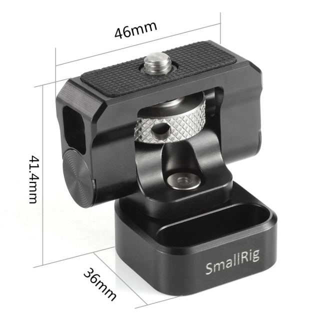 Nosilec za monitor SmallRig 2294 za vrtenje in nagibanje je zasnovan za namestitev monitorja na kletko kamere, ročaj ali drug sistem za namestitev z dvema vijakoma 1/4"-20. Robusten aluminijast nosilec omogoča 360-stopinjsko vrtenje in 150-stopinjski nagib brez uporabe orodja. Lahki nosilec tehta le 68 g in lahko podpira 5" in 7" monitorje s težo do 1,2 kg. Na vrhu ima gumijaste blazinice, ki preprečujejo praske na monitorju. Vijak za palec ima luknje za šestilo, s katerimi ga lahko ponovno zategnete in tako poskrbite za varnost monitorja. Ko nosilca ne uporabljate, ga lahko preprosto zložite in shranite.