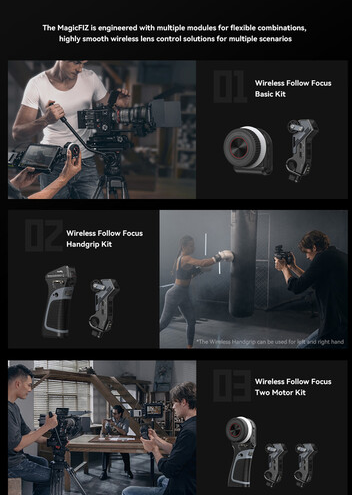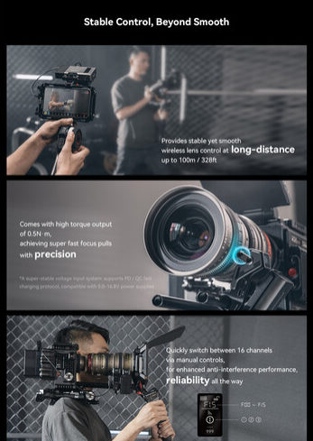 Komplet brezžičnega krmilnika SmallRig 3917B Wireless Follow Focus Controller Kit vključuje elektronski krmilni modul Bluetooth LE, brezžični ročaj, adapter za ročaj in kabel USB-C, ki omogočajo natančno krmiljenje objektiva in zagon/ustavitev kamere (prek dodatnih kablov) za sisteme SmallRig MagicFIZ, z 0,96-palčnim OLED zaslonom, pomnilnikom za primer izpada napajanja, vibracijskim povratnim signalom in baterijo LP-E6 v ergonomski obliki za profesionalne video opreme.