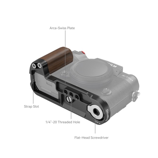 SmallRig Leseno držalo v obliki črke L za FUJIFILM X-T50 (črno) 4784 je namenjeno izboljšanju oprijema fotoaparata. Držalo v obliki črke L se na fotoaparat pritrdi z vijakom 1/4"-20 na dnu, vgrajene silikonske blazinice pa preprečujejo praske. Držalo je izdelano iz naravnega masivnega lesa, elegantno, z bogatim, naravnim občutkom, in ergonomsko oblikovano za izboljšanje občutka prijema. Vgrajena osnovna plošča s hitrim sproščanjem Arca-Swiss omogoča enostavno in hitro montažo in demontažo stativa tipa Arca. Štiri luknje z navojem 1/4"-20 na dnu za pritrditev ploščic in stativov tipa Manfrotto. Reža za zapestni trak (ID: 3848). Vgrajen ploščati ključ na dnu za enostavno sestavljanje in razstavljanje dodatne opreme. Držalo je opremljeno z ekskluzivnim pokrovom vroče čevlje, na katerem sta odtisnjena zvočni val "FUJIFILM" in leto ustanovitve kot naš poklon družbi FUJIFILM. Opremljen je tudi z gumbom za sprostitev zaklopa, ki zagotavlja mehak in udoben dotik s prsti.