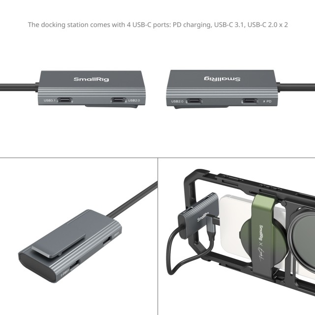 SmallRig x Brandon Li All-in-One Mobile Video Kit Full Quick Release Co-design Edition 4596 je popolna celostna rešitev za profesionalno snemanje videoposnetkov s pametnim telefonom. Komplet vključuje univerzalno kletko za mobilni telefon, vrtljiv stranski ročaj z ohišjem M.2 SSD in brezžičnim daljinskim upravljalnikom, 67 mm univerzalni adapter za filter, magnetni 67 mm VND 2-32 (1-5 Stop), priklopno postajo 4-In-1 USB-C, adapter za hitro sproščanje Arca-Swiss, držalo za napajalno banko in drugo dodatno opremo. Univerzalna kletka podpira 67-milimetrske magnetne filtre, kar zagotavlja rešitve proti bleščanju za večino mobilnih telefonov in zmanjšuje uhajanje svetlobe iz filtra. Vrtljivo stransko držalo z brezžičnim upravljanjem združuje več funkcij in ima ohišje za SSD M.2, ki podpira neposredno zunanje snemanje. Snemljiv brezžični upravljalnik omogoča fotografiranje na daljavo, ostrenje in povečevanje/pomanjševanje. Brezstopenjsko vrtenje adapterja ročaja omogoča takojšnje preklapljanje med načinoma stranskega in zgornjega ročaja, mehanizem za hitro sprostitev na obeh straneh pa omogoča hitro montažo in prilagajanje brez uporabe orodja. V kompletu je priložen tudi adapter za hitro sprostitev Arca-Swiss, ki podpira hitro pritrditev na kletko in profesionalne stative. Komplet kletke zagotavlja več standardnih lukenj z navojem 1/4"-20 in pritrdišča za hladne čevlje, kar podpira prosto kombiniranje dodatne opreme in zagotavlja več možnosti za fotografiranje. Priključna postaja 4 v 1 USB-C ponuja visokozmogljiva vrata za polnjenje PD 100 W, vrata USB-C 3.1 in dve vrati USB-C 2.0. Pri uporabi za mobilno videografijo omogoča hkratno polnjenje, shranjevanje videoposnetkov ProRes in uporabo mikrofona USB-C.
