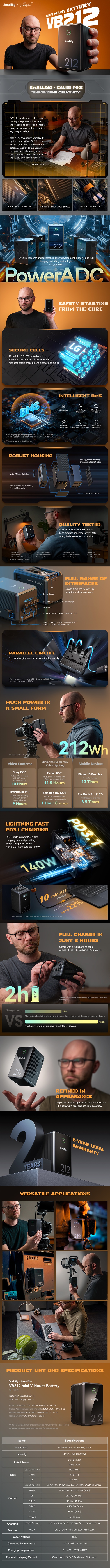Baterija SmallRig x Caleb Pike VB212 mini V Mount 4293 ima zelo integrirano zasnovo, ki zmanjšuje velikost baterije ter jo dela lažjo in prenosnejšo. Baterija združuje čipe s protokolom za hitro polnjenje, MCU, nadzor napetosti in BMS. Podpira širok nabor protokolov za hitro polnjenje (PD 3.1 / QC 3.0 / AFC itd.), dvosmerno hitro polnjenje in praznjenje PD 140 W (največ) ter prilagodljivo regulacijo napetosti/toka itd. Poleg tega prilagojen inteligentni sistem BMS zagotavlja hitrejše in varnejše polnjenje z zagotavljanjem zaščite pred prekomernim tokom / kratkim stikom / previsoko temperaturo / prenapetostjo itd. Ohišje baterije je opremljeno z vmesniki D-Tap / USB-C / USB-A / DC 8V-OUT / DC12V-OUT / BP, s katerimi lahko polnite ali napajate fotoaparat / videokamero / monitor / brezžični oddajnik slike / LED video svetilko / mobilni telefon / prenosni računalnik itd. brez uporabe plošč za V-mount.