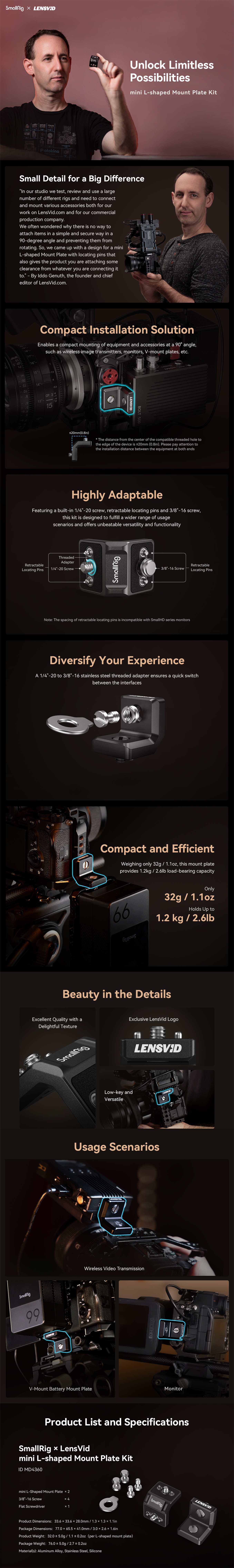 SmallRig x LensVid mini L-Shaped Mount Plate Kit MD4360 sta zasnovala Iddo Genuth, soustanovitelj in urednik LensVid.com, spletne strani za fotografijo in video, ki deluje že 10 let, in SmallRig DreamRig program. Ta komplet zagotavlja kompaktnejšo rešitev za namestitev opreme in dodatkov, kot so brezžični oddajniki slike, monitorji, plošče V-mount itd. pod kotom 90° na fotoaparat. Na voljo so tudi štiri rešitve za pritrditev: 1/4"-20 vijak, 1/4"-20 lokacijski vijak, 3/8"-16 vijak in ARRI 3/8''-16 lokacijska luknja, da lahko naši uporabniki izpolnijo več scenarijev uporabe. V napravo je vgrajena nedrseča silikonska podloga, ki ščiti fotoaparat pred praskami in zagotavlja varno namestitev. Nosilnost 1,2 kg/2,6 lb je združljiva z večino brezžičnih oddajnikov slike in dodatne opreme.