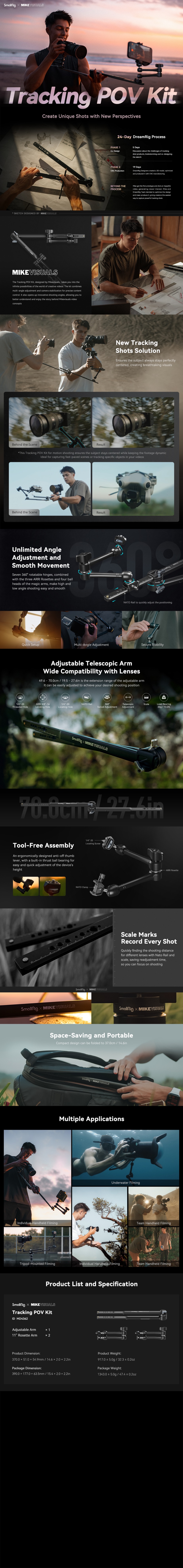 SmallRig x Mikevisuals Tracking POV Kit MD4362 je v okviru SmallRigovega programa DreamRig sooblikoval Mikevisuals, ki se ukvarja s snemanjem filmov, turizma, znanosti in tehnologije. Njegov namen je olajšati sledenje posnetkom, približevanje in oddaljevanje itd. Nastavljiva roka je opremljena z nastavki za dodatno opremo, kot so luknje z navojem 1/4"-20, lokacijske luknje ARRI 3/8"-16 ter vodila NATO, ki hitro povežejo magične roke in pomagajo prilagoditi razdaljo snemanja. Lahko jo podaljšate za 49-70 cm in skrajšate na 37 cm za lažje shranjevanje, nosilnost obeh koncev pa je 3 kg. Obe tirnici NATO sta dolgi 20,5 cm, primerni za različne goriščne razdalje objektivov in imata lestvice za zapisovanje podatkov o razdalji. 11-palčna rozetna roka z nosilnostjo 3 kg ima tudi vijak 1/4"-20 z namestitvenimi zatiči in tirnico NATO.
