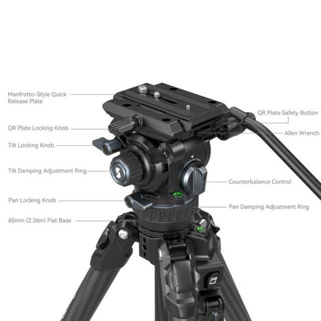 Zaradi konstrukcije iz ogljikovih vlaken je stativ lahek in enostaven za prenašanje, ne da bi pri tem ogrozil trdnost, ter podpira največjo nosilnost, ki ustreza potrebam večine profesionalnih snemalcev. Noge stativa so opremljene s ključavnicami za hitro sprostitev, ki omogočajo hitro in varno nastavitev, nastavljiva sredinska razporna palica pa daje stativu dodatno stabilnost na neravnem terenu. Komplet vključuje tudi oblazinjeno torbo za priročno prenašanje in shranjevanje.