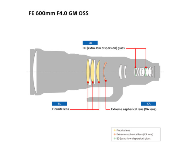 Njegova napredna optična konstrukcija vključuje tri fluoritne elemente, dva ED-elementa in en XA-element (ekstremno asferični), ki zagotavljajo izjemno ostrino, jasnost in minimalno kromatsko aberacijo po celotnem kadru. Sonyjev Nano AR-premaz dodatno zmanjšuje bleščanje in podvajanje slike, kar zagotavlja visok kontrast in natančnost barv tudi v zahtevnih svetlobnih pogojih. 11-lamelna krožna zaslonka ustvarja gladek, kremast bokeh, ki poudari ločitev motiva.