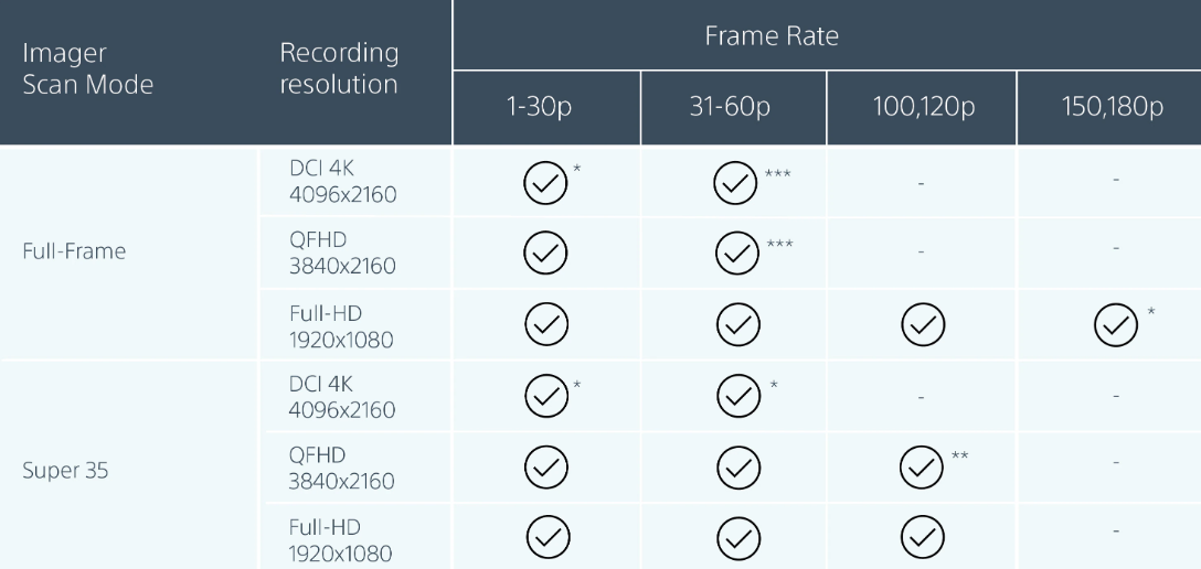 Kamera ima 15-stopinjski dinamični razpon in snema 10-bitno 4:2:2 na dve reži za pomnilniške kartice XQD, ki podpirata hkratno in izmenično snemanje ter več načinov rezervnega snemanja, ki uporabljajo datoteke proxy. Kamera lahko interno snema v ločljivostih UHD (3840 x 2160) in HD (1920 x 1080) z možnostjo izbire hitrosti snemanja od 1 do 60 sličic na sekundo v formatih XAVC-I, XAVC-Long in MPEG HD. Po prihodnji posodobitvi vdelane programske opreme bo lahko snemal HD s hitrostjo do 180 sličic na sekundo in oddajal 16-bitne neobdelane posnetke 4K/2K s hitrostjo do 120 sličic na sekundo. Poleg širokega dinamičnega razpona njegove izboljšane barvne in svetlobne lastnosti vključujejo dvojno osnovno občutljivost ISO 800/4000, ki je uporabna v slabih svetlobnih razmerah ali pri uporabi objektivov z nižjimi zaslonkami. Njegov 7-stopenjski elektronski spremenljivi filter ND lahko deluje v samodejnem ali ročnem načinu in se neprekinjeno prilagaja od 1/4 do 1/128 svetlobnega toka. Privzeti barvni videz fotoaparata S-Cinetone ponuja enako mehke in živahne tone kot Sonyjev fotoaparat VENICE.