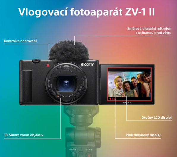 Sony ZV-1 II je kompaktna kamera za vloganje, namenjena ustvarjalcem vsebin, opremljena z 1-palčnim senzorjem z ločljivostjo 20,1 MP, snemanjem videa v ločljivosti 4K in vsestranskim širokokotnim zum objektivom 18–50 mm. Z naprednim avtofokusom, vgrajeno stabilizacijo in pametnimi načini snemanja omogoča snemanje videov profesionalne kakovosti v prenosni obliki.