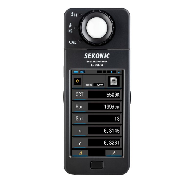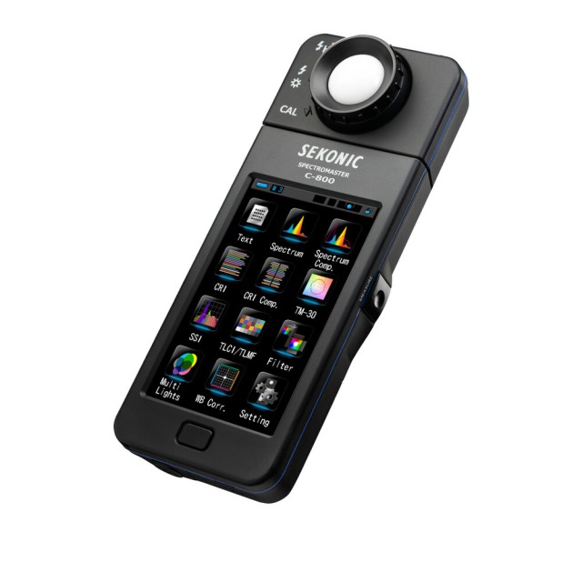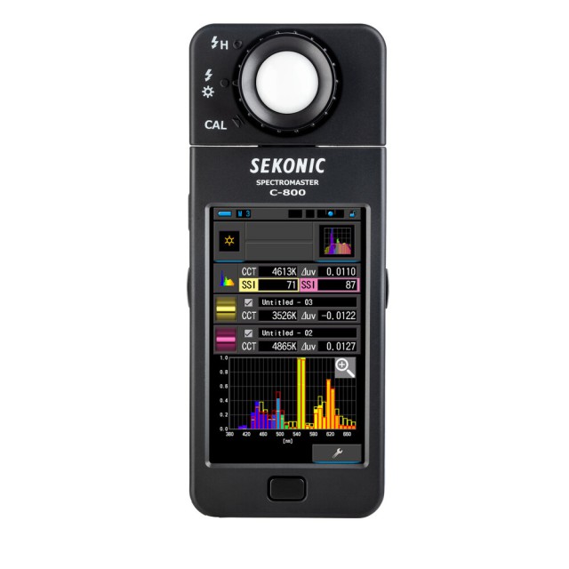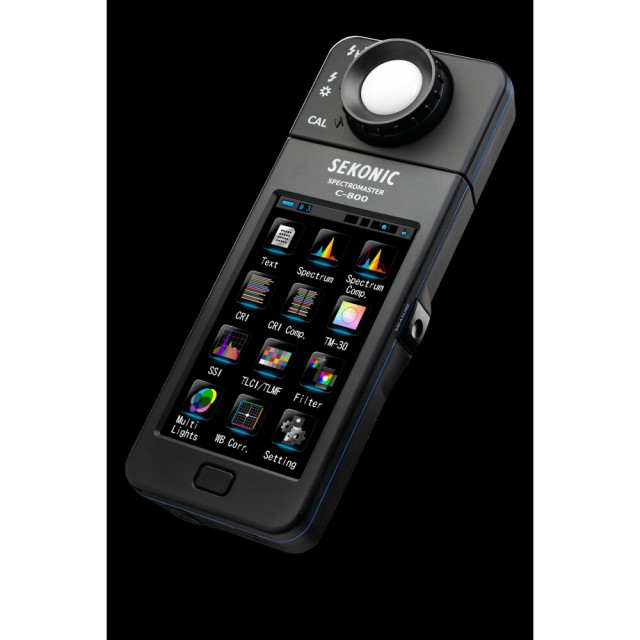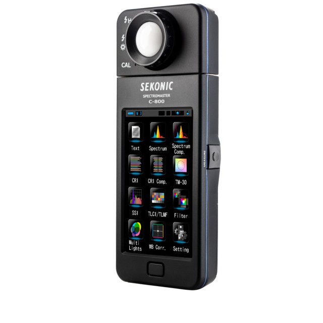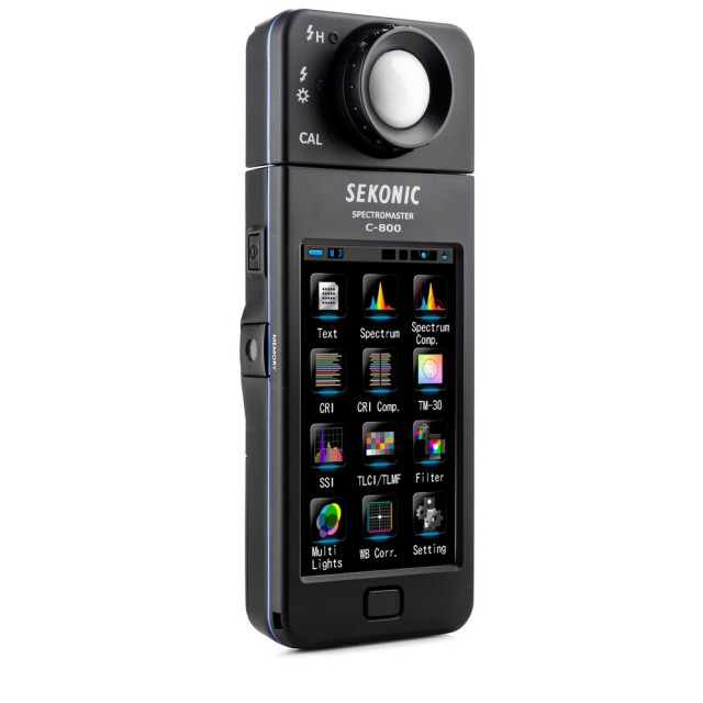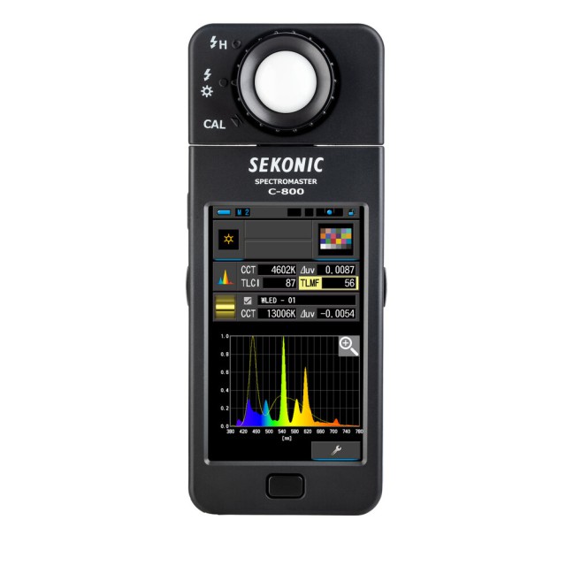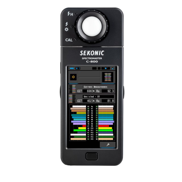 Sekonicovbarvni merilnik C-800 SpectroMaster je napreden terenski merilnik, namenjen fotografom, snemalcem, kamermanom in snemalcem, ki lahko zazna praktično vsak vir svetlobe, naj bo to LED, bliskavica, žarnica, HMI, fluorescenca ali naravni svetlobni spekter. Najpomembneje je, da je to priročno orodje za osvetljevanje, ki na svojem 4,3-palčnem barvnem zaslonu na dotik z 11 različnimi načini prikaza analizira vir svetlobe in vam natančno pokaže, kaj morate storiti, da dosežete želeni učinek. Senzor CMOS merilnika omogoča meritve z natančnostjo do 1 nm in lahko zajame barvne skoke v izhodu svetlobe - to je še posebej dragocena lastnost pri delu z LED, HMI, fluorescenčno razsvetljavo in mešanimi viri.