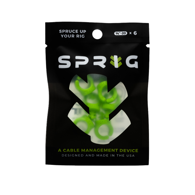Zelena naprava za upravljanje kablov Sprig, ki je na voljo v paketu 6 kosov, filmskim ustvarjalcem in zvočnim inženirjem zagotavlja hitro, priročno in preprosto rešitev za vzdrževanje reda na kablih filmske opreme in snemalnih naprav. S hitrim zasukom jo je mogoče namestiti v luknjo z navojem 1/4"-20 ali odstraniti iz nje. Ker je izdelan iz trpežnega brizganega materiala, je odporen proti zahtevnim razmeram na prizorišču snemanja.