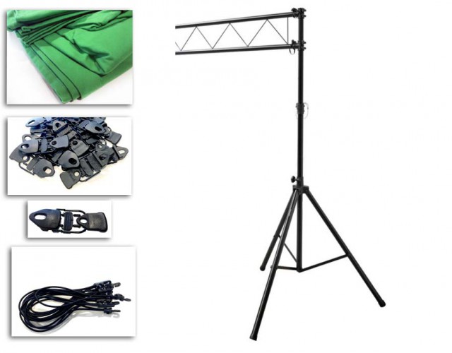 Zeleno ozadje 3x3 m, vključno s stativi in povezovalno konstrukcijo za obešanje tkanine. Celovita rešitev za ključevanje.
