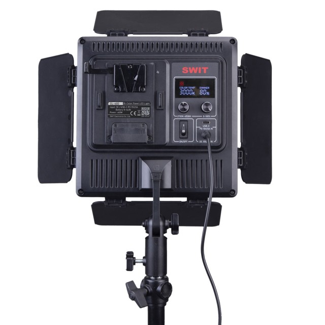 Za priročno nastavitev CL-40D podpira več načinov napajanja z baterijo V-mount, USB-C in 15 V DC. V paketu je priložen adapter AC-DC.