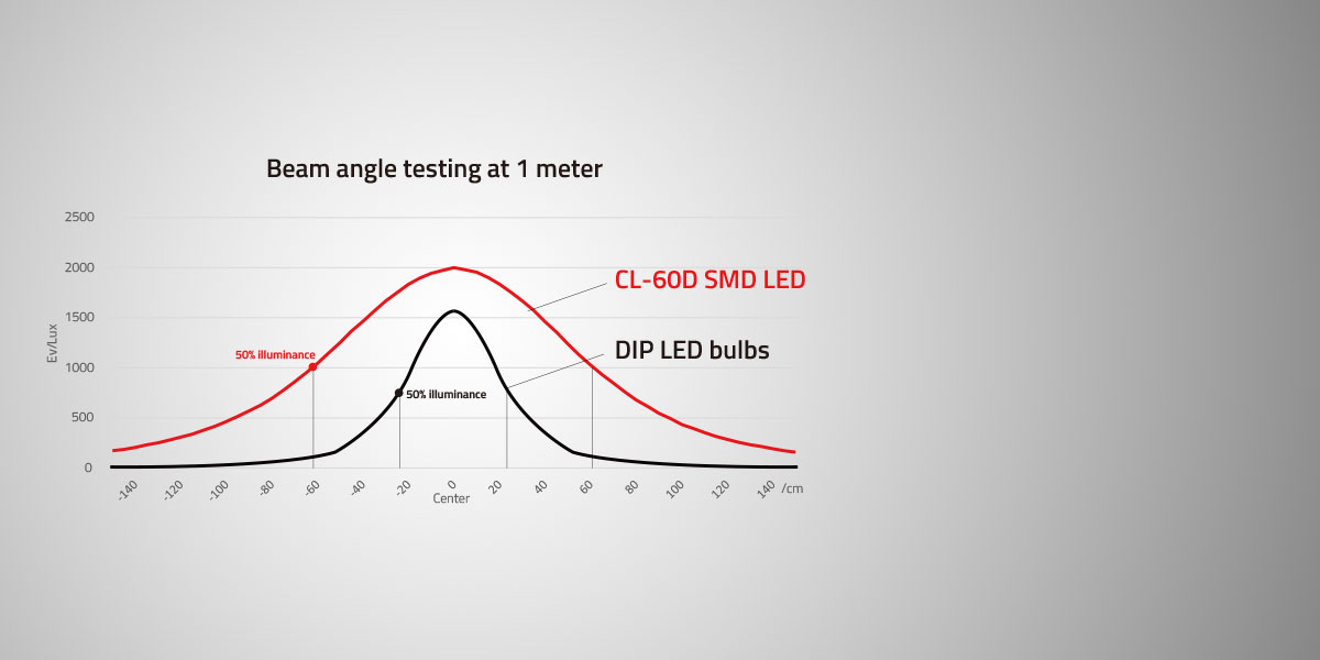 SMD LED-i imajo širši kot svetlobnega snopa v primerjavi s tradicionalnimi DIP LED-žarnicami. Ustvarjajo enakomerno razporejeno svetlobo od sredine do roba, namesto bleščeče svetlobne pike, ki se nenadoma zmanjša od sredine do roba.