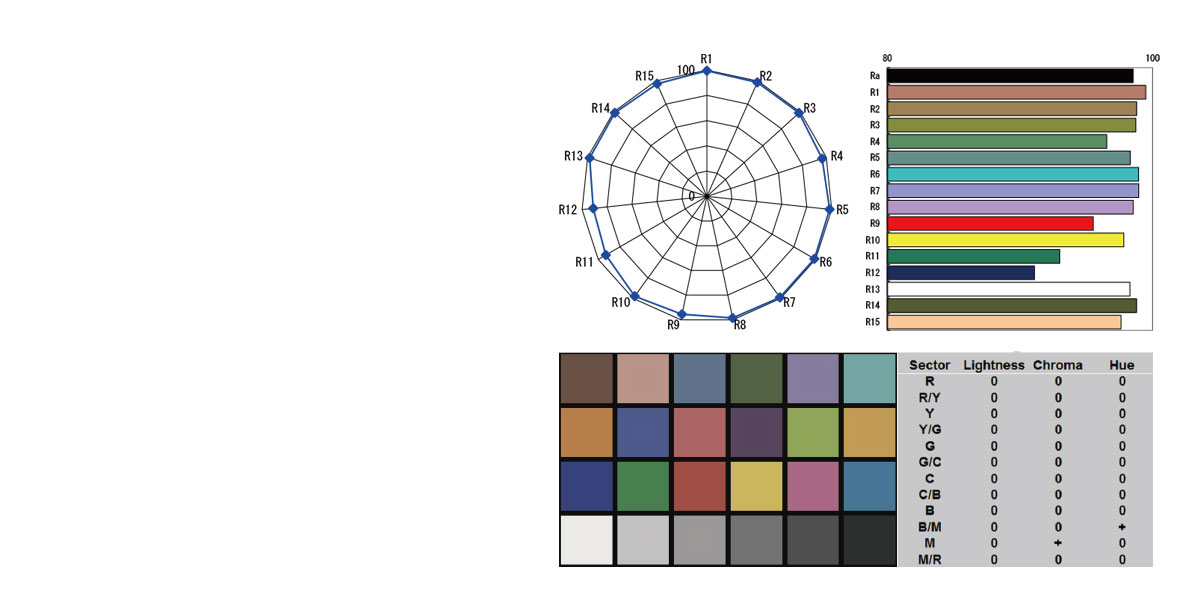 CRI (indeks barvnega upodabljanja) je mera za sposobnost svetlobnega vira, da zvesto prikazuje barve različnih predmetov v primerjavi z naravnim svetlobnim virom. TLCI (indeks skladnosti televizijske osvetlitve) je posebej namenjen za sposobnost prikazovanja barv s senzorjem kamere. Največja vrednost je 100.
