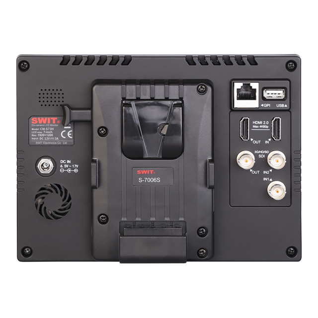 CM-S73H podpira vhodno napetost 6,5-17 V DC prek 5,5-milimetrske zaklepne vtičnice DC, za napajanje pa lahko namestite baterijske plošče SWIT S-7006 serije V-mount / Gold mount / DV.
