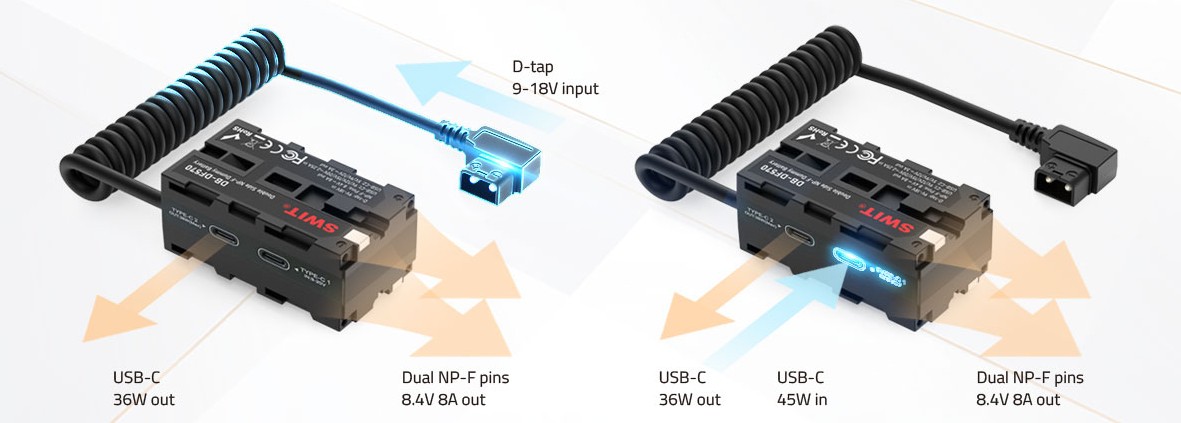 Lažna baterija DB-DF570 podpira napajanje D-tap 9–18 V ali USB-C PD 45 W in pretvarja v dvojni izhod NP-F s reguliranim izhodom 8,4 V 8 A in izhodom USB-C PD 36 W.