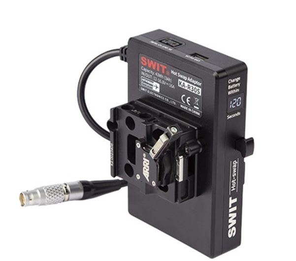SWIT KA-R30S V-mount Hotswap Plate je namenska rešitev za kamere ARRI ALEXA MINI in MINI LF, ki omogoča nemoteno menjavanje baterij brez izklopa kamere. KA-R30S je opremljen z vgrajenimi 43Wh baterijskimi celicami, ki omogočajo konstantno obremenitev 200W, in zagotavlja neprekinjeno delovanje vsaj 2 minuti med zamenjavo baterije, kar operaterjem daje dovolj časa za namestitev nove baterije brez izgube moči.