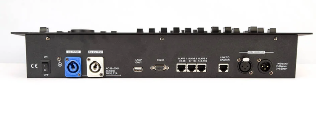 Povezljivost vključuje 3-pinski XLR DMX vhod/izhod, daljinski upravljalnik RS232, serijsko povezavo RJ45 in PowerCON AC 88–256 V za vhod in izhod zanke. Konzola je kompaktna in robustna, meri 482 × 265 × 75 mm in tehta 2,65 kg, kar jo naredi primerno za prenosne ali stalne svetlobne postavitve.