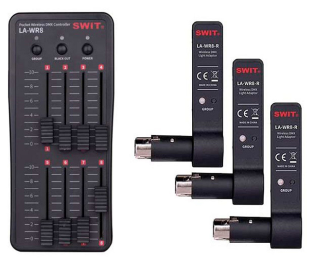 SWIT LA-WR8 Tx+3Rx Kit je žepni brezžični DMX krmilnik, ki vključuje 1 oddajnik in 3 sprejemnike ter omogoča brezžično krmiljenje 2,4G do 400 m (LOS). Združljiv je z vsemi standardnimi DMX512 svetilkami, odpravlja zapleteno ožičenje in omogoča hitro, plug-and-play krmiljenje osvetlitve za produkcije na terenu in v studiu.