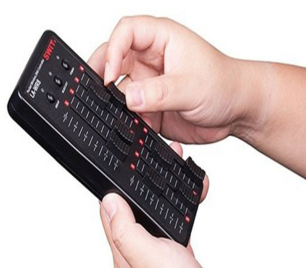 Sistem uporablja brezžični prenos 2,4G, ki zagotavlja hitro povezovanje, močno zaščito pred motnjami in prenosno razdaljo do 400 metrov v vidnem polju. Krmilnik podpira standardni protokol DMX512 in ima 8 drsnikov s 7 skupinami stikal (skupaj 56 DMX kanalov), ki so označeni s 7-barvnimi LED-diodami za enostavno prepoznavanje in sinhronizacijo s sprejemniki.