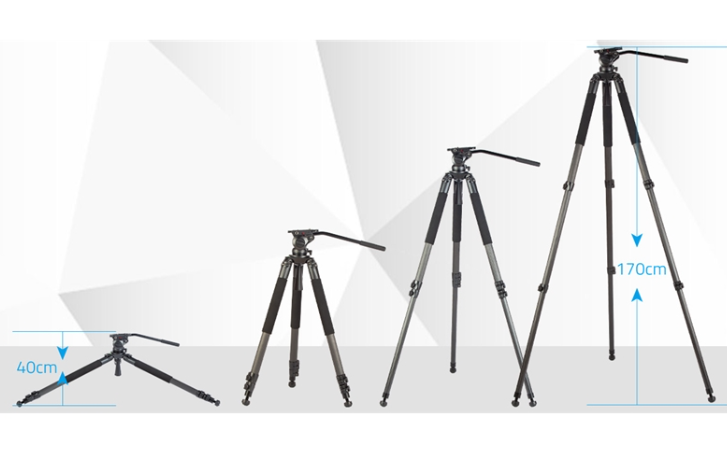 Njegove 3-delne noge so nastavljive od 40 cm do 170 cm z nastavitvijo kota nog od 25° do 75°, medtem ko gladka tekoča glava podpira do 10 kg in ima dinamično protiutež za natančno gibanje kamere. Stojalo omogoča 360° zasuk in nagib od -75° do +90°, kar omogoča širok razpon snemalnih kotov.