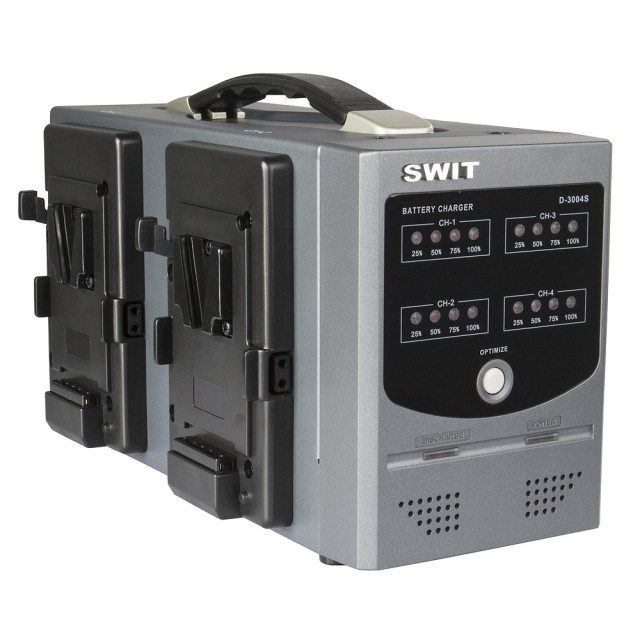 SWIT PC-P430S je popolnoma sočasen 4-kanalni polnilec baterij z V-nastavkom in indikatorjem LED za stanje polnjenja posamezne baterije. PC-P430S ima 2x 4-pinske izhode XLR.