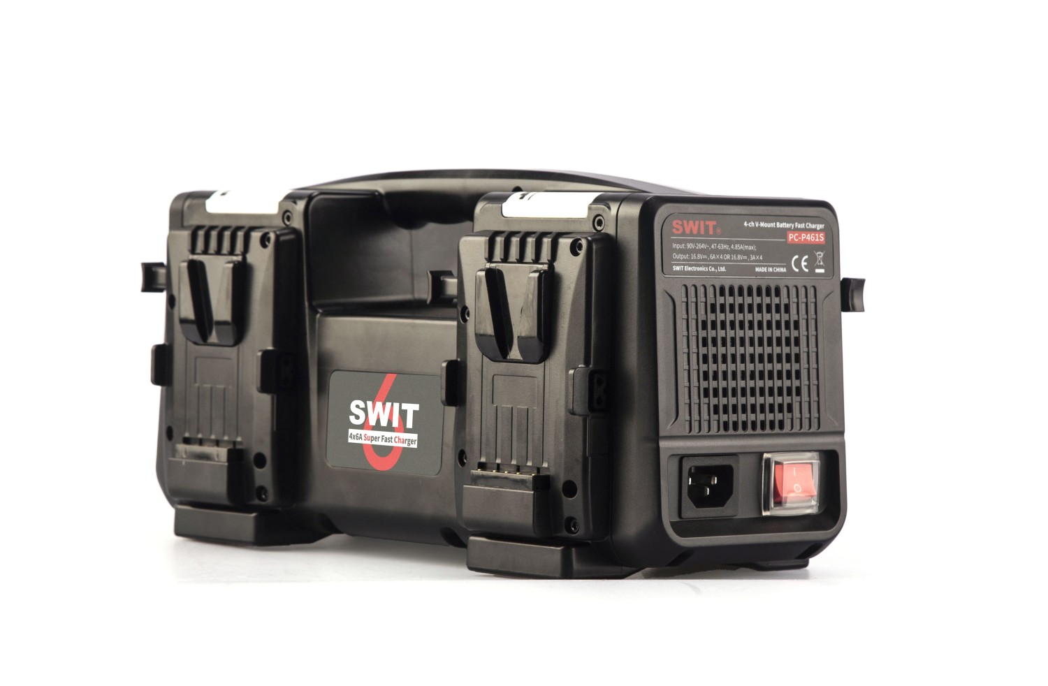 SWIT PC-P461S je popolnoma sočasen 4-kanalni 4x100W superhitri polnilnik za V-mount z LCD-zaslonom za informacije o stanju polnjenja posamezne baterije.