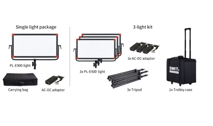 SWIT PL-E90D 3KIT je profesionalna prenosna svetlobna rešitev, zasnovana za uporabo v televizijskih oddajah, dokumentarcih, intervjujih in studijih. Vsaka LED plošča PL-E90D uporablja 480 SMD LED-diod, nameščenih na robovih, v kombinaciji z edinstveno tehnologijo 90° svetlobnega vodnika SWIT, ki zagotavlja izjemno mehko, svetlo in enakomerno porazdeljeno svetlobo, hkrati pa ohranja vitko in lahko obliko.