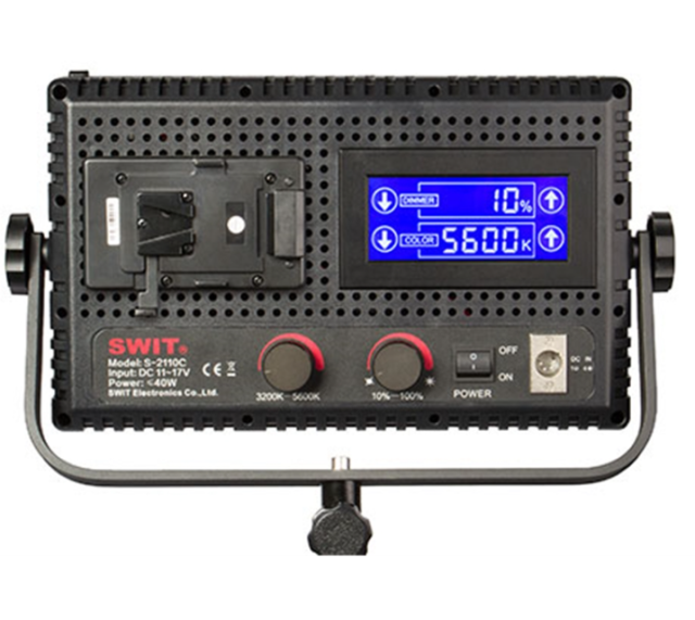 SWIT S-2110CS je kompakten 40 W dvobarvni LED-panel, ki zagotavlja do 1600 luksov na 1 meter, z gladkim nastavljanjem barvne temperature od 3200 K do 5600 K. Opremljen je s 576 ultra-svetlimi LED-diodami, brez utripanja in LCD-zaslonom na dotik, zato je idealen za intervjuje, studijske, ENG in mobilne produkcijske postavitve. Podpira napajanje z baterijo V-mount ali AC-DC adapterjem.